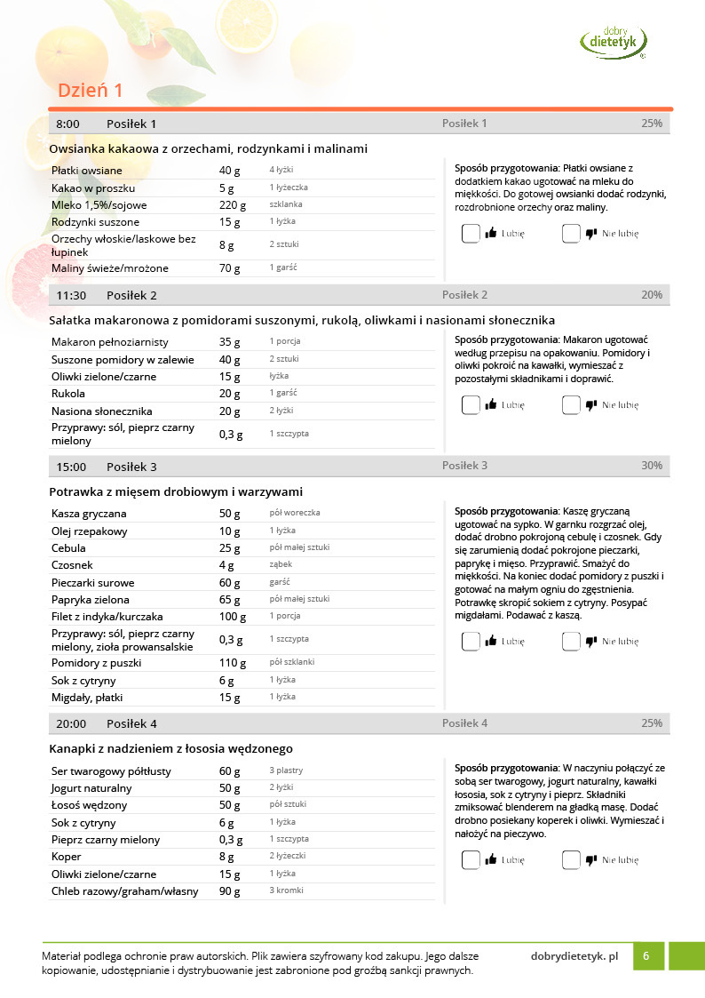• w formie precyzyjnych jadłospisów wielodniowych (na każdy dzień miesiąca jest opracowany osobny jadłospis). Tutaj nie musisz zastanawiać się co zjeść każdego dnia, gdyż będziesz mieć dokładnie wszystko rozplanowane.