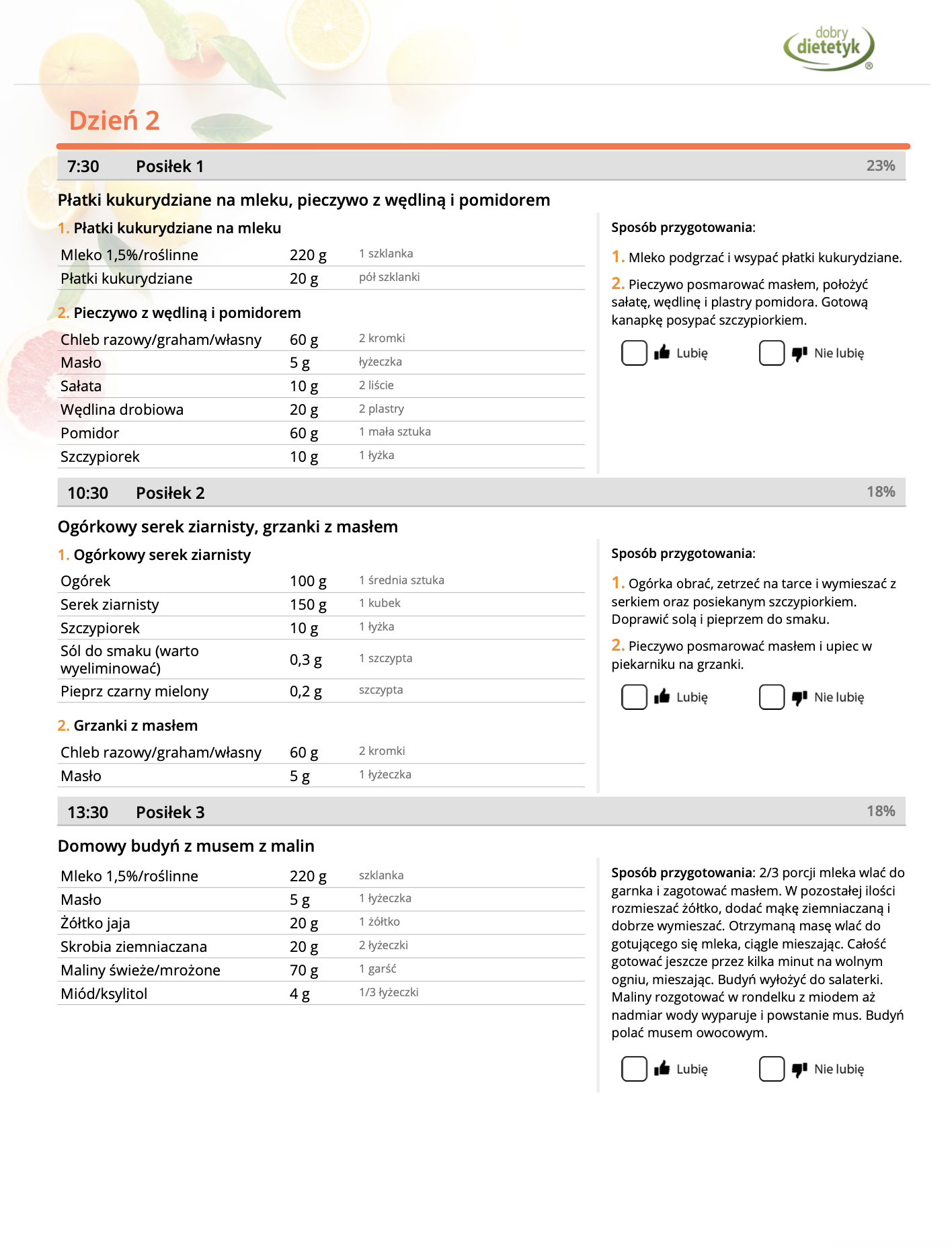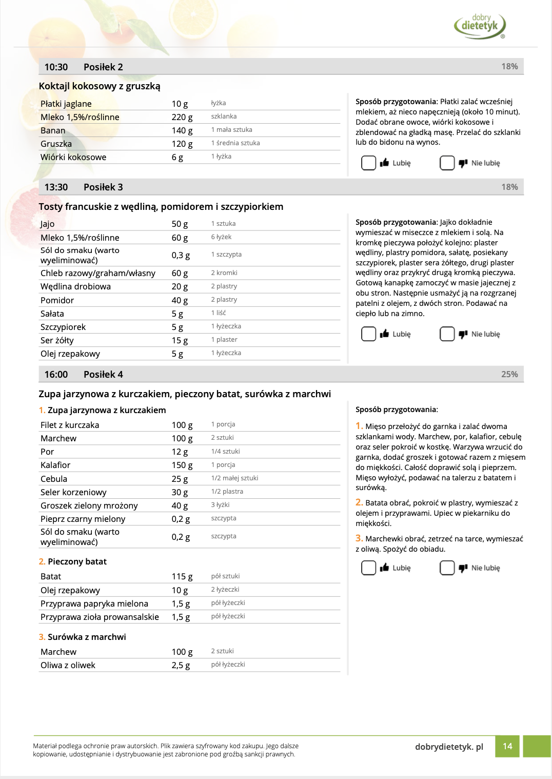 • w formie propozycji posiłków (zamiast pojedynczych jadłospisów jednodniowych, przygotowano propozycje kilku propozycji dań na każdy posiłek). Tutaj nie uzależniamy Cię od tego jakie masz np. w danym dniu zjeść śniadanie czy obiad, tylko sam wybierasz sobie ulubione danie z kilku przedstawionych przez nas propozycji.